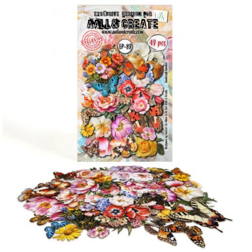 Een verzameling van 49 kleurrijke bloemen en vlinders, gedrukt op stevig wit papier.