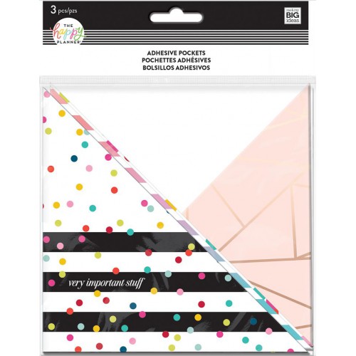Er zitten 3 pockets in deze set. De afmeting per pocket is ongeveer 15 x 15 cm. Zijn eenvoudig te bevestigen door zelfklevende strips aan de achterkant. Maak eenvoudig een hoek zakje/vakje om losse papiertjes of bonnetjes te bewaren in je planner of journal. Plak twee hoeken tegenovergesteld naast elkaar en maak een pocket in je eigen gewenste breedte.