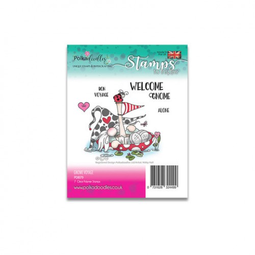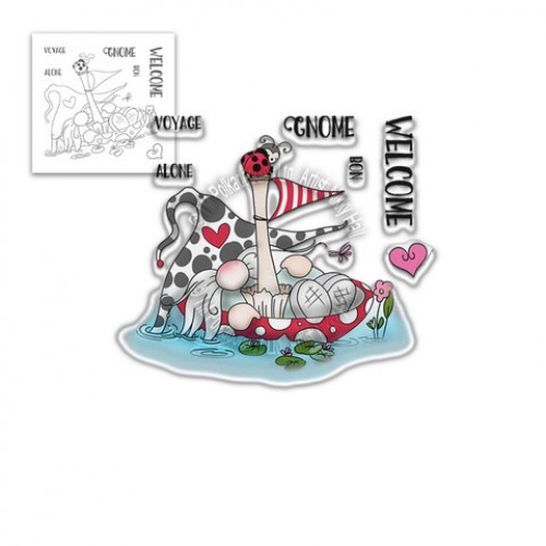 Bevat 7 stempels. Afmeting stempel van gnome in paddenstoelenboot is ongeveer 9 x 8,5 cm.